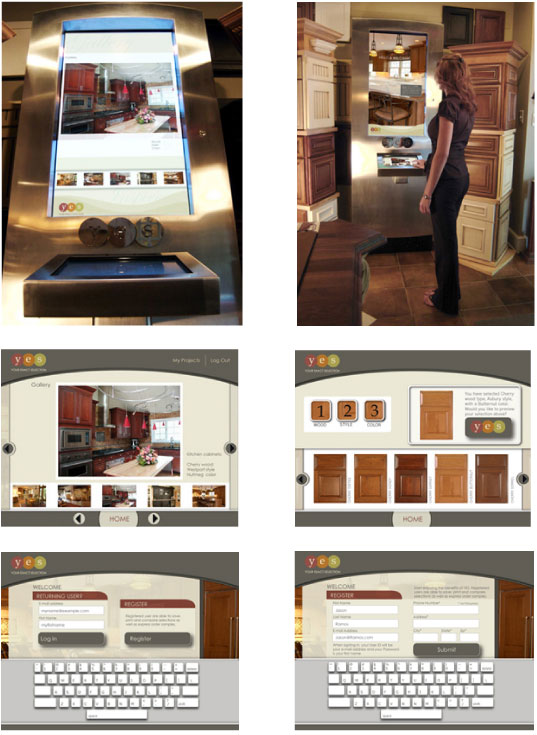 YES Kiosk- This 42" plasma monitor and 15" touch screen tool walks the user through the daunting task of selecting cabinet doors. By simplifying this process into 3 easy steps; selecting a wood type, a style and a color, the user is instantly able to preview their exact selection. Other options such as having their selection saved, ordering a sample or have a representative contact them have been built into the program. I was in charge of designed the wire framing, user interface and coordinated programming.