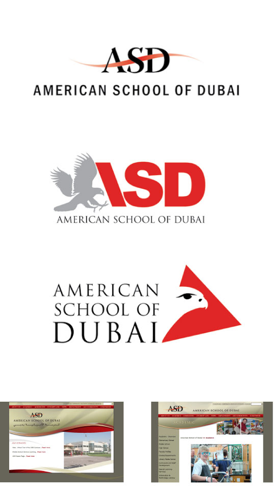 Logo Design for American School of Dubai in Dubai. Approved logo with two alternate concepts. Web design shown is to show use of logo.