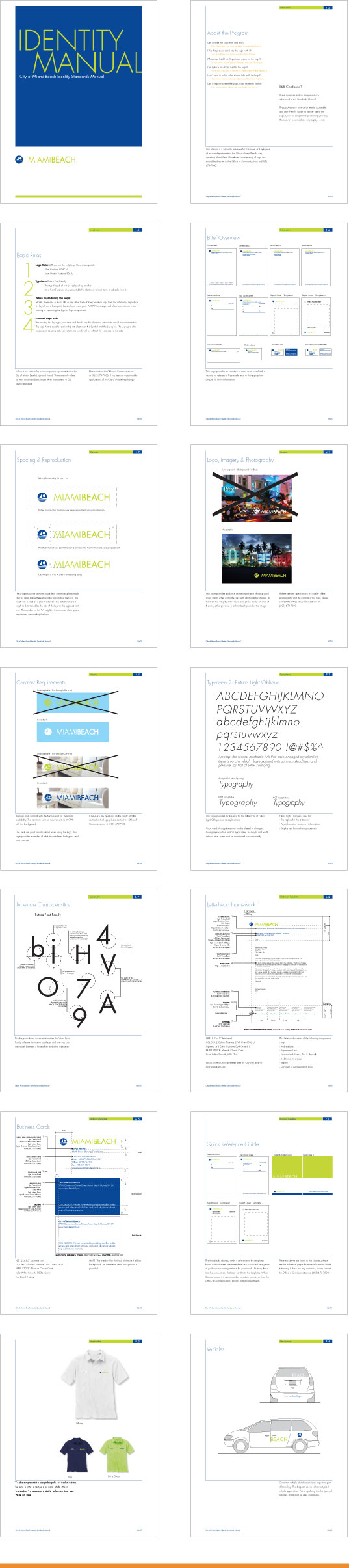 Working in a team at Hillier, we produced The City of Miami Beach branding standards manual. After re-branding the logo and corporate identity, this 40 page manual was developed as a reference guide for all possible uses and application for the city.