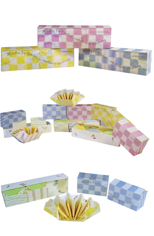 This packaging project is an exploration of knockdown construction. This fictitious company houses nine verities of crackers in funky square boxes, 3 to a package. Each square box can be placed on a table with out a plate and opens out in a fun graphic pattern. The crackers are spaced separately in a diagonal fan like display for each munching.