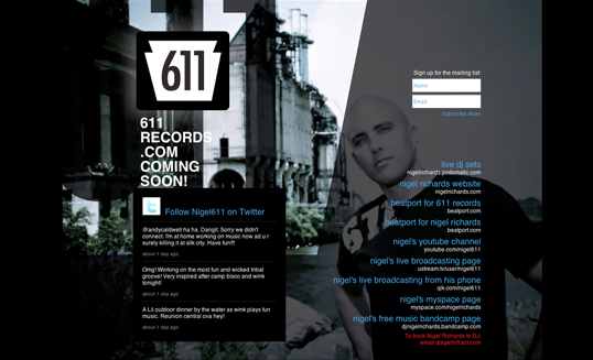 A multi faceted splash page designed for Nigel Richards at 611 Records that displays live Twitter feeds and multiple other social media sites to help keep his fans in the loop.